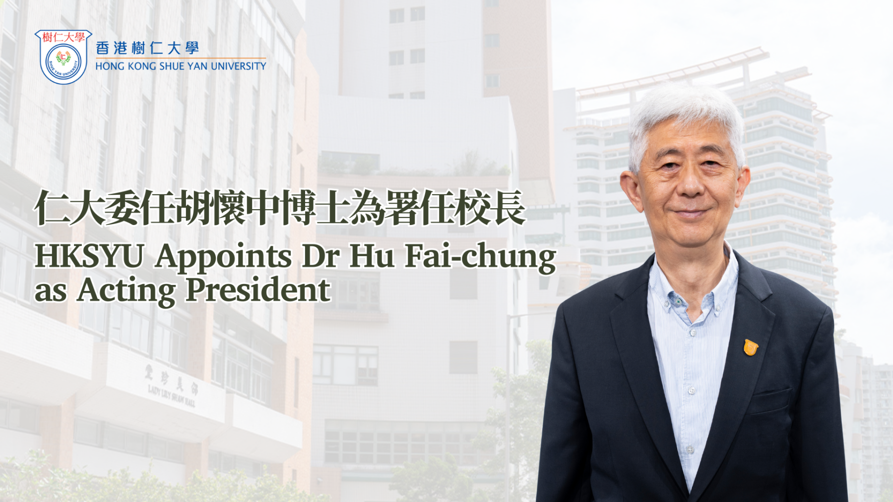The Board of Governors of Hong Kong Shue Yan University (HKSYU) has approved the appointment of Dr Hu Fai-chung, Deputy President, as Acting President of the University, effective immediately.