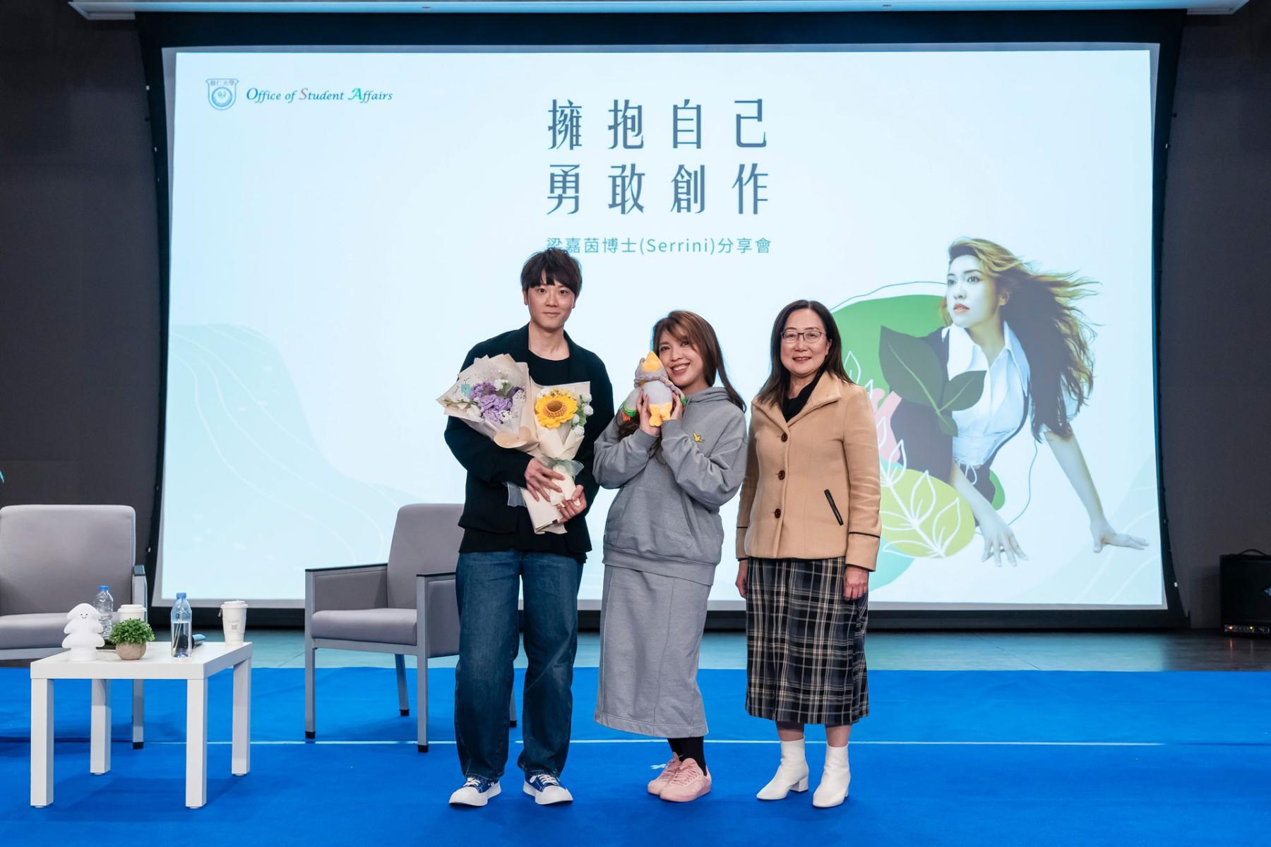 HKSYU’s Office of Student Affairs hosted a sharing session with singer Dr Leung Ka-yan (Serrini). In conversation with Dr Ho Ka-chun, Associate Head (Programme) of the Department of Chinese Language and Literature, Serrini shared how her secondary school life shaped her mental and emotional well-being. She also discussed embracing one’s true self and maintaining psychological health through different stages of life.